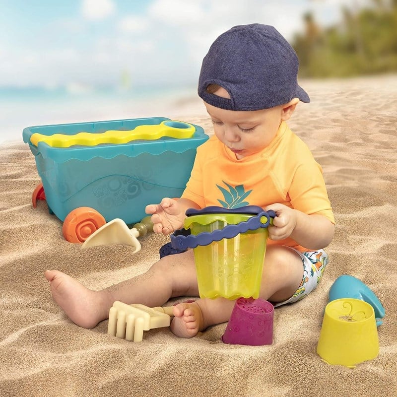 Saplı vagon ile oyuncakları plajda taşımak çok kolay