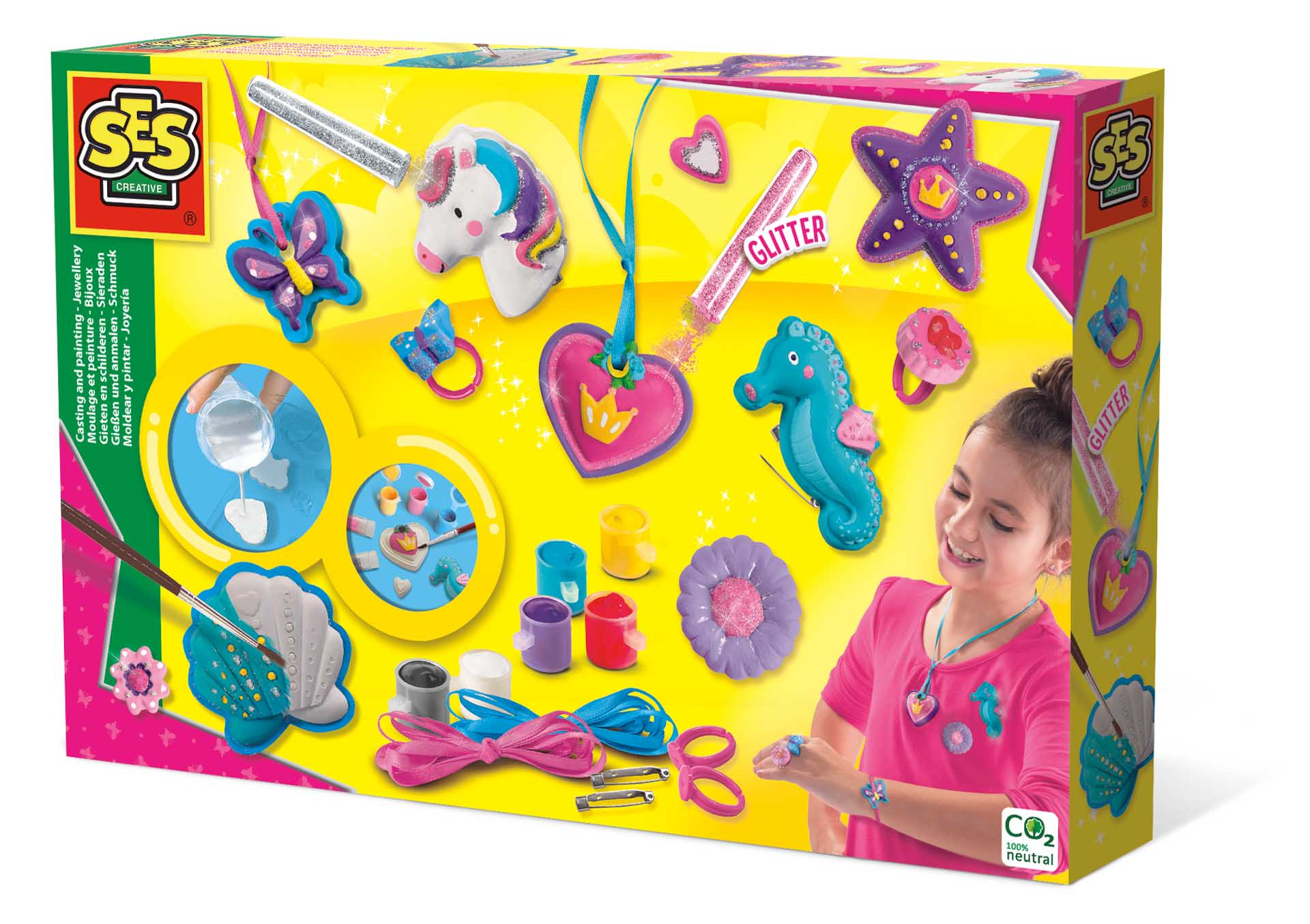 Hep bir mücevher yaratıcısı mı olmak istediniz? Bu eğlenceli ve kolay kullanmlı sette, önce güvenli ve hızlı kuruyan alçı karışımı su ile karıştırılıp kalıba dökülecek ve kurumaya bırakılacak. Kolayca kendi broş, yüzük, ve kolyelerinizi yapabilirsiniz. Mücevherler kuruduktan sonra paket içerisinden çıkan 6 renk boya ve fırçayla boyanacak, simlerle süslenecek. Boya ve alçılar ciltten veya tekstilden yıkanarak kolayca çıkabilmektedir. Yaratıcılığı, konsantrasyonu ve ince motor becerilerini geliştirmek için harika bir ürün. Ses Creative 40 yıldan uzun bir süredir güvenli ve yaratıcı oyuncaklar geliştirmektedir. Bu ürün Hollanda’da üretilmiştir.